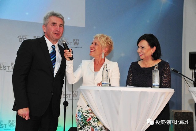 左起:北威州经济部部长安德雷亚斯·平克瓦特博士教授、西德广播主持人Beate Kowollik、北威州投资促进署署长华珮在去年颁奖典礼上